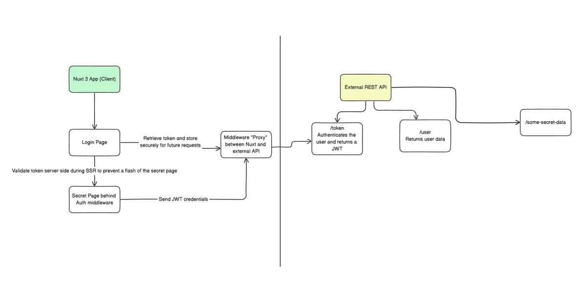Before we start, here's my setup. I have an external REST API that handles all the back-end tasks, and we want our "front-end" application (Nuxt 3) to authenticate against this external API in a secure way.