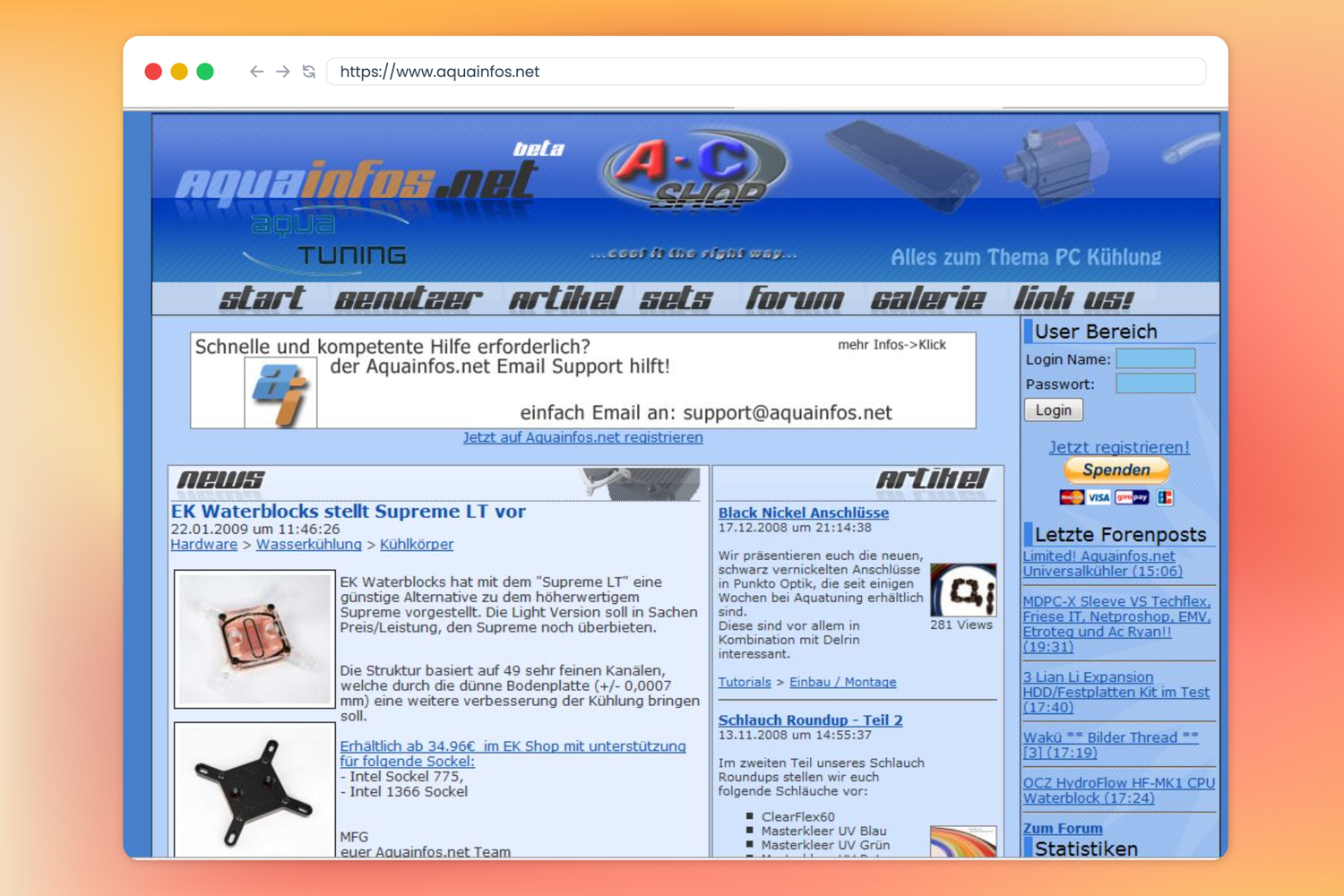 A community for PC water cooling existed at aquainfos.net. The first programming for the website was entirely self-written by Mr. Heike. Later, WordPress and PhpBB would be added to the website.