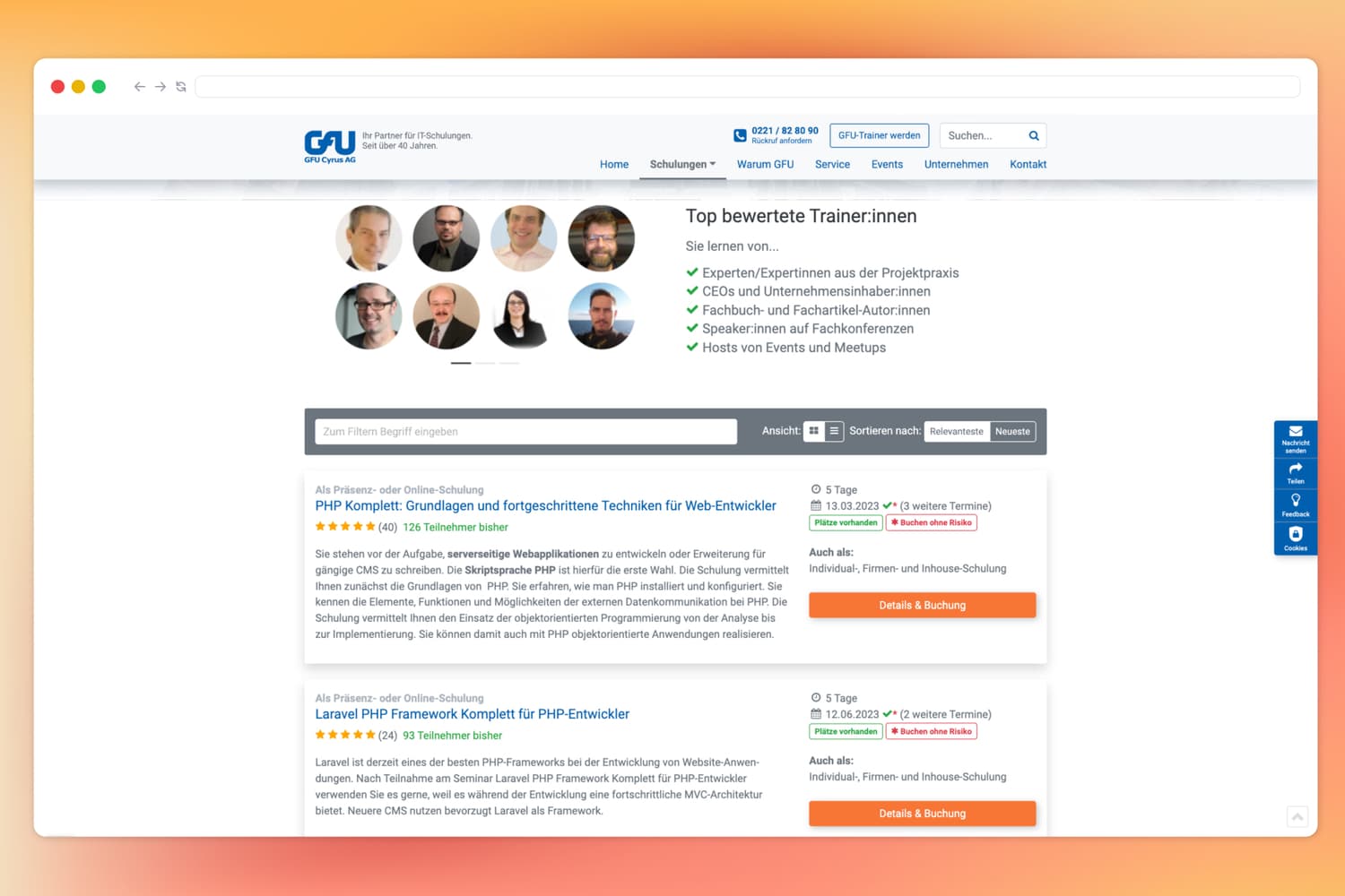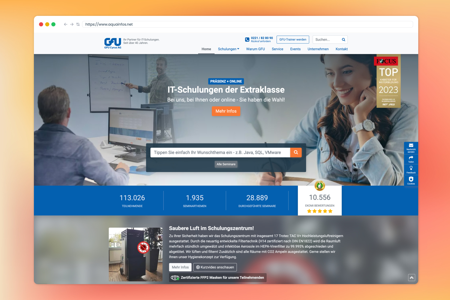 We were happy to support a client from Cologne, Germany for more than 5 years. GFU Cyrus AG is a Cologne, Germany-based provider of IT seminars. With a significant emphasis on conversion optimization, the project's main objective was to design and evaluate a new website for the client. One of the biggest issues we had was coming up with a user-friendly and aesthetically pleasing design while yet making sure the site was search engine optimized. Working directly with the customer to comprehend their unique requirements and project goals was exciting. We were able to use a number of technologies, including HTML, CSS, JavaScript, to produce a successful final product.