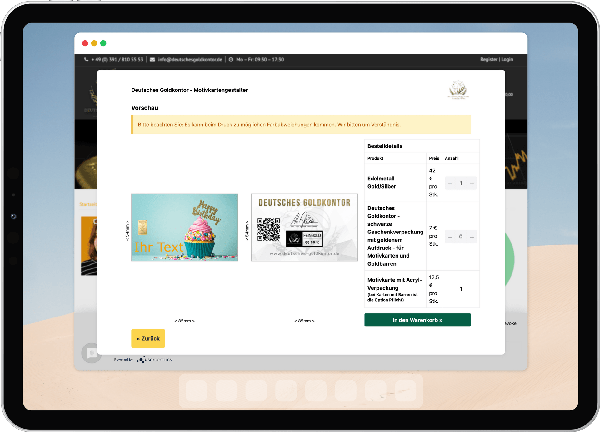 The client has an online shop for gold, silver, and coins. A standalone configurator should be developed to enable customers to create, design, and order custom gift cards, featuring a small gold plate on the front. The project featured a full graphics editor with text, resize, upload abilities, and more. Also, a printable PDF is automatically generated.
