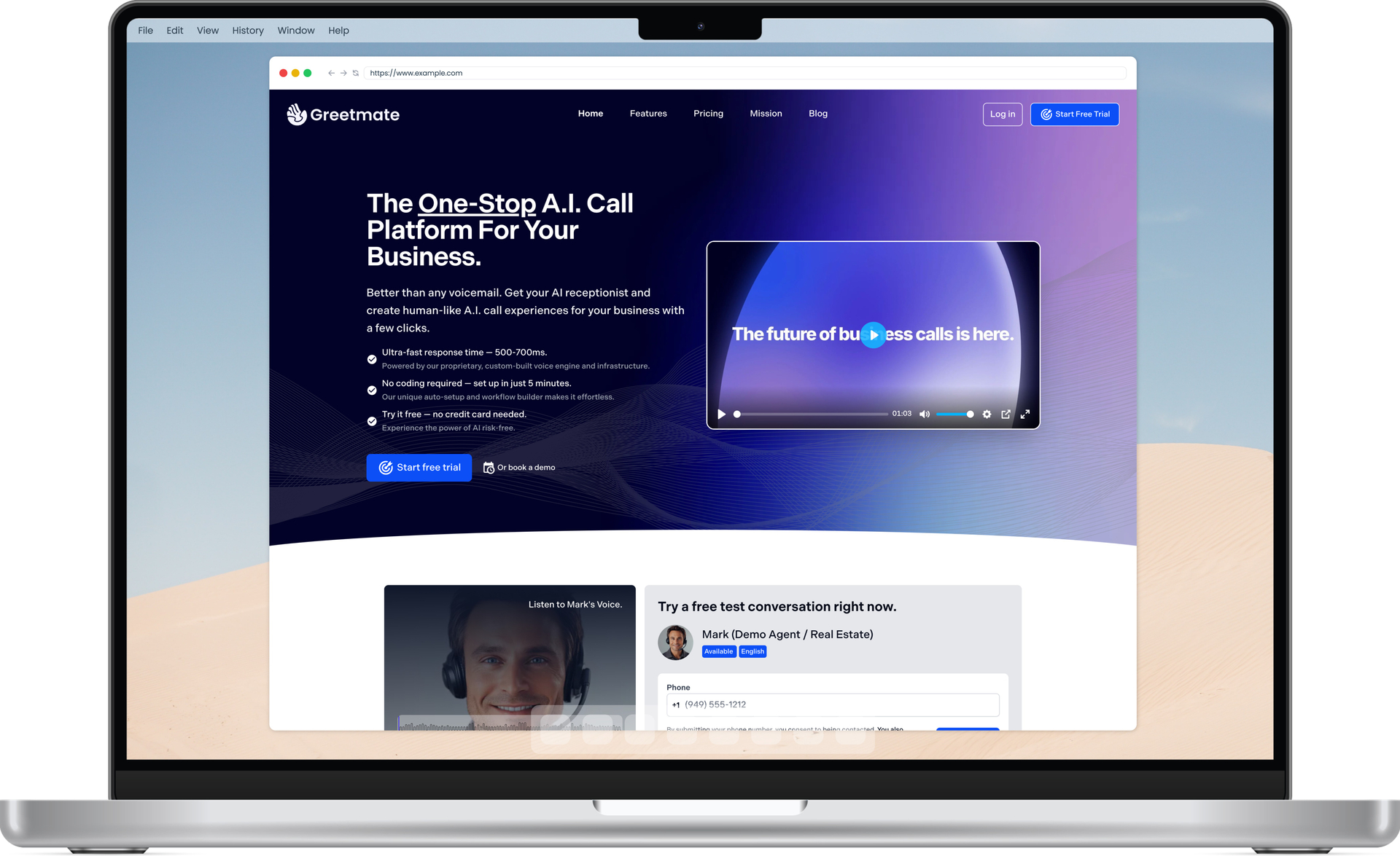 Entirely custom built with Laravel and Vue.js 3, and others Greetmate.ai is an Easy-to-Use Virtual Receptionist with Local Number Access. It provides a virtual AI receptionist to it's users.It harnesses the power of GPT for receptionist needs. Ideal for small businesses with the most natural voice available on the market.